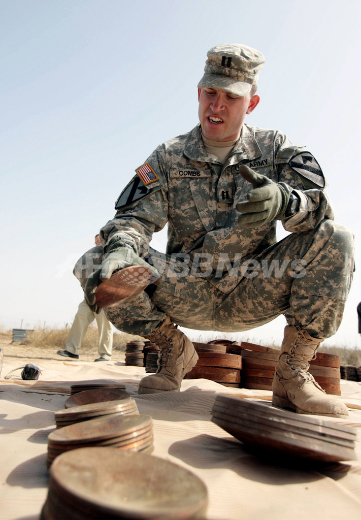【バグダッド/イラク 27日 AFP】駐イラク米軍は24日、バグダッド北方25キロのシーア派の村Jadidahで保管されていた徹甲爆弾など、大量の爆発物や製作用部品を発見した。米軍高官が26日、公表した。多くはイランから密輸されたものとみられる。米軍指揮官らは、イラン政府による直接関与の追及は難しいが、兵器のほとんどは明らかにイラン製であると語った。写真は26日、自身の率いる陸軍第1機甲師団が発見した爆破物製作用の銅板を公開する米軍大尉。(c)AFP/ALI AL-SAADI