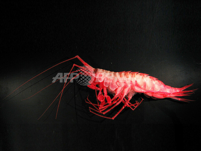 【南極 27日 AFP】南極で崩壊した2つの棚氷周辺の観察から、南極の生態系の一環を示すまったく新種の生物たちが発見された。研究者らが25日、報告を発表した。2つの棚氷は「ラーセンA(Larsen A)」と「ラーセンB(Larsen B)」と呼ばれ、それぞれ12年前と5年前に崩壊し、その後巨大な氷山を形成。確認された新生物は甲殻類やイソギンチャクなどで、どれも非常に繊細な形態をしていた。写真はEusirus属(プランクトンのエビ属の一種)に属する巨大な端脚目の甲殻類。南極半島(Antarctic Peninsula)沖で探検隊の釣り針にかかり採集された(2006年12月21日撮影)。(c)AFP/Cedric d'Udekem d'Acoz