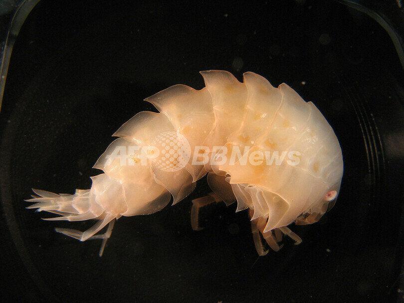 【南極 27日 AFP】南極で崩壊した2つの棚氷周辺の観察から、南極の生態系の一環を示すまったく新種の生物たちが発見された。研究者らが25日、報告を発表した。2つの棚氷は「ラーセンA(Larsen A)」と「ラーセンB(Larsen B)」と呼ばれ、それぞれ12年前と5年前に崩壊し、その後巨大な氷山を形成。確認された新生物は甲殻類やイソギンチャクなどで、どれも非常に繊細な形態をしていた。写真はEusirus属(プランクトンのエビ属の一種)に属する巨大な端脚目の甲殻類。南極半島(Antarctic Peninsula)沖で探検隊の釣り針にかかり採集された(2006年12月21日撮影)。(c)AFP/Cedric d'Udekem d'Acoz