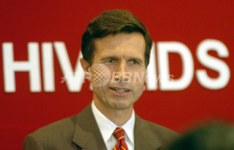 写真はインドのムンバイ(Mumbai)で、企業経営者向けのエイズ対策セミナーに参加するブレーク大使(2005年7月8日撮影当時はインド大使館勤務)。