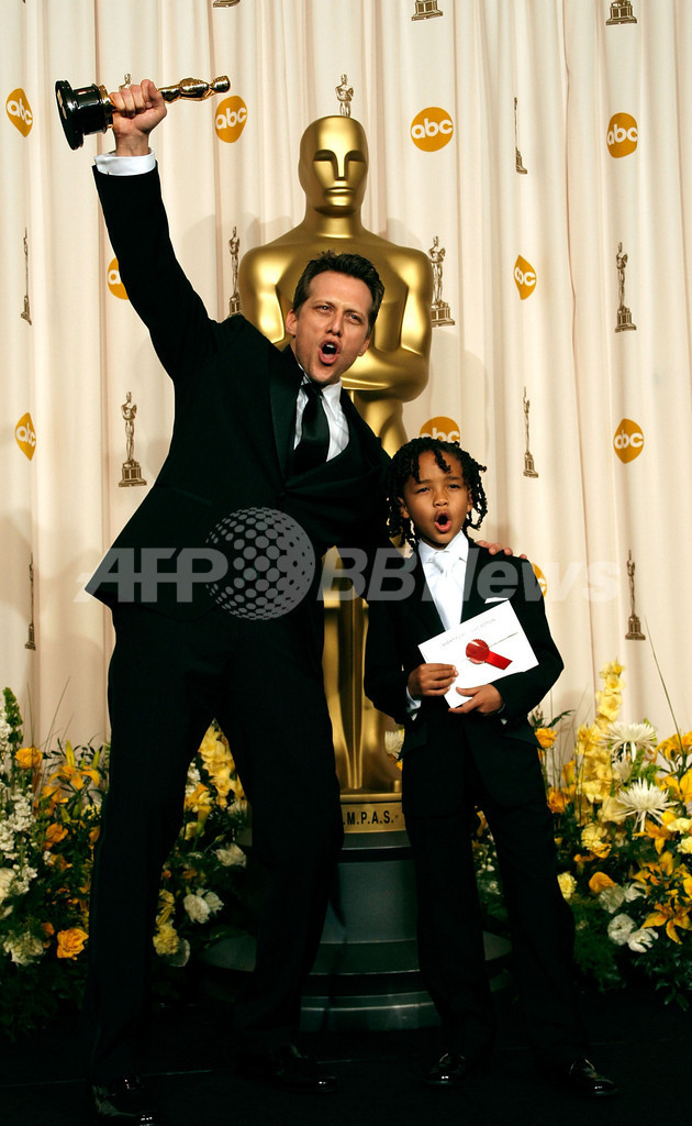 【ロサンゼルス/米国 25日 AFP】ロサンゼルスで25日開催された第79回アカデミー賞(The 79th Academy Awards)授賞式で、「ウェスト・バンク・ストーリー(West Bank Story)」が短篇実写映画賞を受賞した。写真はトロフィーを手にする監督のアリ・サンデル(Ari Sandel左)とプレゼンターのジェイデン・スミス(Jaden Smith)。(c)AFP/Getty Images Vince Bucci