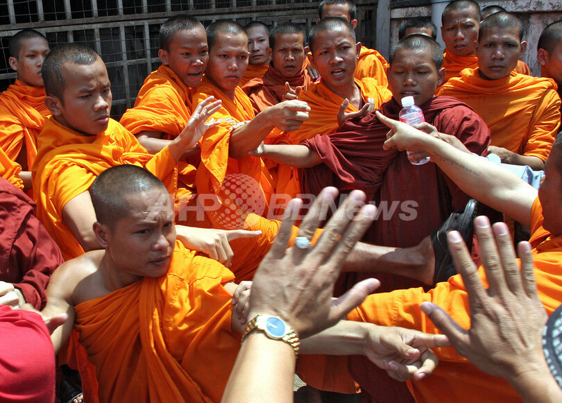写真は同日、警官隊ともみ合う僧侶ら。(c)AFP/TANG CHHIN SOTHY