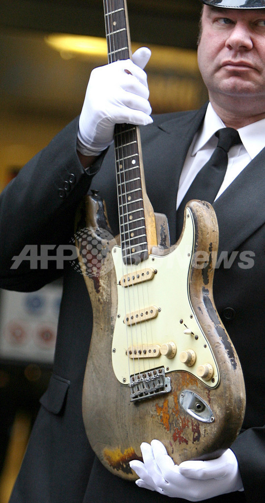 写真は同展の開幕日、アイルランドの伝説的ギタリスト故ローリー・ギャラガー(Rory Gallagher)のサイン入りフェンダー社(Fender)のストラトキャスター(Stratocaster、1961年)を手にするローリーの甥、ダニエル・ギャラガー(Daniel Gallagher)。(c)AFP/JOHN D MCHUGH
