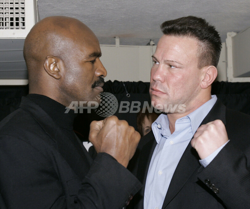 写真は、記者会見でファイティングポーズをとるホリフィールド(左)とMaddalone。(c)AFP/Stan HONDA