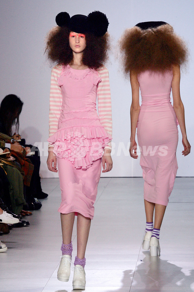 会場には子供向きのピアノ曲が流れ、ショーの冒頭はバイオレットのシフォンの細身のドレス、頭にはミッキーマウスのような黒の帽子、素朴なソックスに白いハイヒールを合わせたモデルが現れた。一見無邪気で子供っぽい雰囲気だが、どこかちぐはぐで不気味な感じを受ける。続いた服も同じタッチだが、パッドをつめて手のように見える手袋がアプリケされたり、服に微妙なふくらみがついたり、真紅のベロアが前身ごろの片側についてどきっとするほどフェミニンな印象が混じったりする。