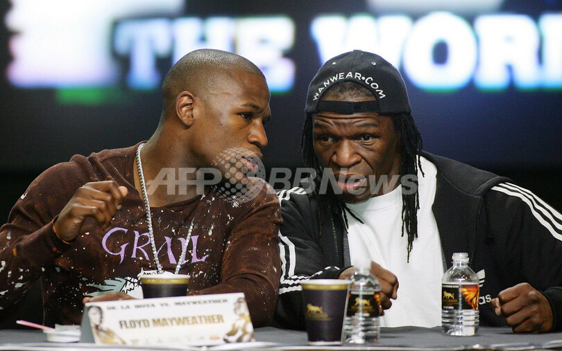 【ラスベガス/米国 27日 AFP】ボクシング、WBC世界スーパーウェルター級タイトルマッチを5月5日に控える同級王者のオスカー・デラホーヤ(Oscar De La Hoya、米国)は、挑戦者のフロイド・メイウェザー・ジュニア(Floyd Mayweather Jr.、米国)と共にラスベガスのMGMグランド・ホテル&カジノ(MGM Grand Hotel/Casino)で開かれた記者会見に出席した。写真は、会見中ににらみ合う両者。(c)AFP/Getty Images Ethan Miller