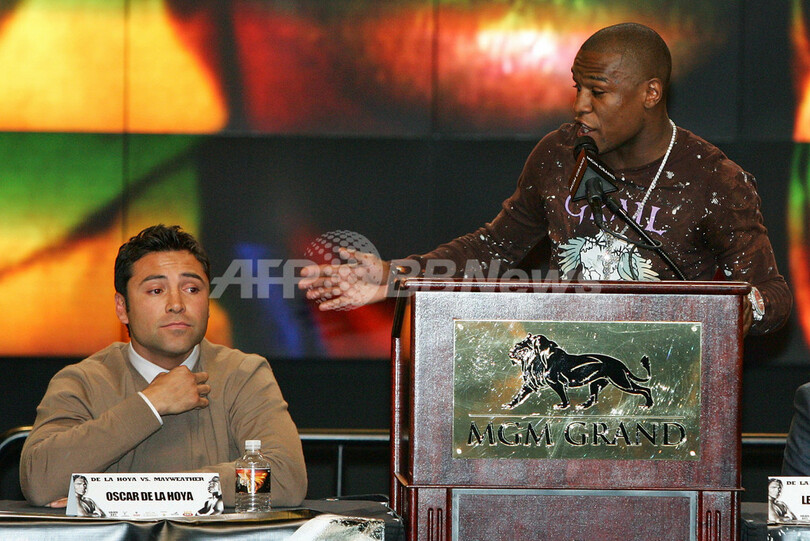 【ラスベガス/米国 27日 AFP】ボクシング、WBC世界スーパーウェルター級タイトルマッチを5月5日に控える同級王者のオスカー・デラホーヤ(Oscar De La Hoya、米国)は、挑戦者のフロイド・メイウェザー・ジュニア(Floyd Mayweather Jr.、米国)と共にラスベガスのMGMグランド・ホテル&カジノ(MGM Grand Hotel/Casino)で開かれた記者会見に出席した。写真は、会見中ににらみ合う両者。(c)AFP/Getty Images Ethan Miller