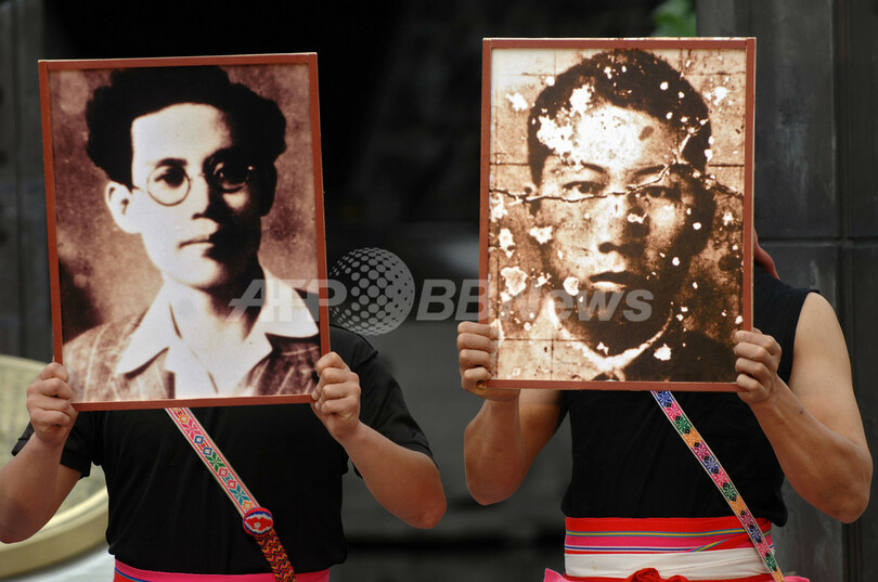 【台北/台湾 28日 AFP】1947年2月28日、台北(Taipei)市から台湾全土へ広がった中国国民党(当時)に対する抵抗運動と、これを鎮圧しようとした国民党軍による武力弾圧「二.二八事件」の発生から60周年を迎えた。この事件により、数万人が殺害されたといわれ、事件当時に布告された戒厳令は1987年まで解除されなかった。独立を志向する現台湾政府は、大虐殺の責任追及を求めている。写真は台北市の公園で28日、二.二八事件発生60周年を記念し、弾圧の犠牲となった台湾人の写真を掲げる人びと。(c)AFP/Sam YEH