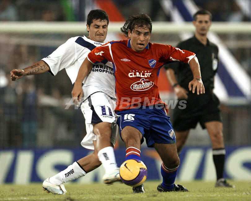 【ブエノスアイレス/アルゼンチン 28日 AFP】サッカー、リベルタドーレス杯南米選手権2007(Copa Libertadores de America 2007)・第2ラウンド、グループ4・第2節、ベレス・サルスフィエル(Velez Sarsfield、アルゼンチン)vsナシオナル・モンテビデオ(Nacional Montevideo、ウルグアイ)。試合は1-1の引き分けに終わった。写真は、ナシオナル・モンテビデオのマルセロ・ソサ(Marcelo Sosa、左)とボールを競るベレス・サルスフィエルのマクシミリアーノ・アンドレス・ブストス(Maximiliano Andres Bustos)。(c)AFP/DANIEL GARCIA