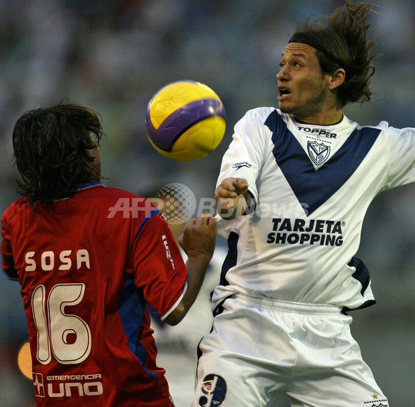 【ブエノスアイレス/アルゼンチン 28日 AFP】サッカー、リベルタドーレス杯南米選手権2007(Copa Libertadores de America 2007)・第2ラウンド、グループ4・第2節、ベレス・サルスフィエル(Velez Sarsfield、アルゼンチン)vsナシオナル・モンテビデオ(Nacional Montevideo、ウルグアイ)。試合は1-1の引き分けに終わった。写真は、ナシオナル・モンテビデオのマルセロ・ソサ(Marcelo Sosa、左)とボールを競るベレス・サルスフィエルのマクシミリアーノ・アンドレス・ブストス(Maximiliano Andres Bustos)。(c)AFP/DANIEL GARCIA