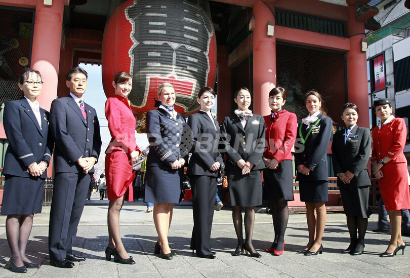 写真は都内で1日、記念撮影に臨む「ワンワールド」加盟航空の客室乗務員ら。(右から)ヨルダン航空、カンタス(Qantas)航空、マレブ・ハンガリー航空、ラン(LAN)航空、日本航空、イベリア(Iberia)航空、フィンランド航空(Finnair)、キャセイ(Cathay Pacific)航空、ブリティッシュ・エアウェイズ(British Airways)、アメリカン航空(American Airlines)。(c)AFP/Yoshikazu TSUNO
