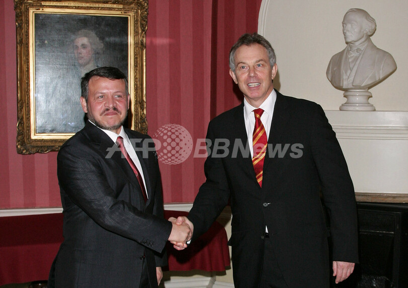 写真は2月28日、会談に訪れたヨルダンのアブドラ・ビン・フセイン(Abdullah Bin Hussein)国王とロンドンの首相官邸(10 Downing Street)で握手するトニー・ブレア(Tony Blair)首相(右)。(c)AFP/SANG TAN