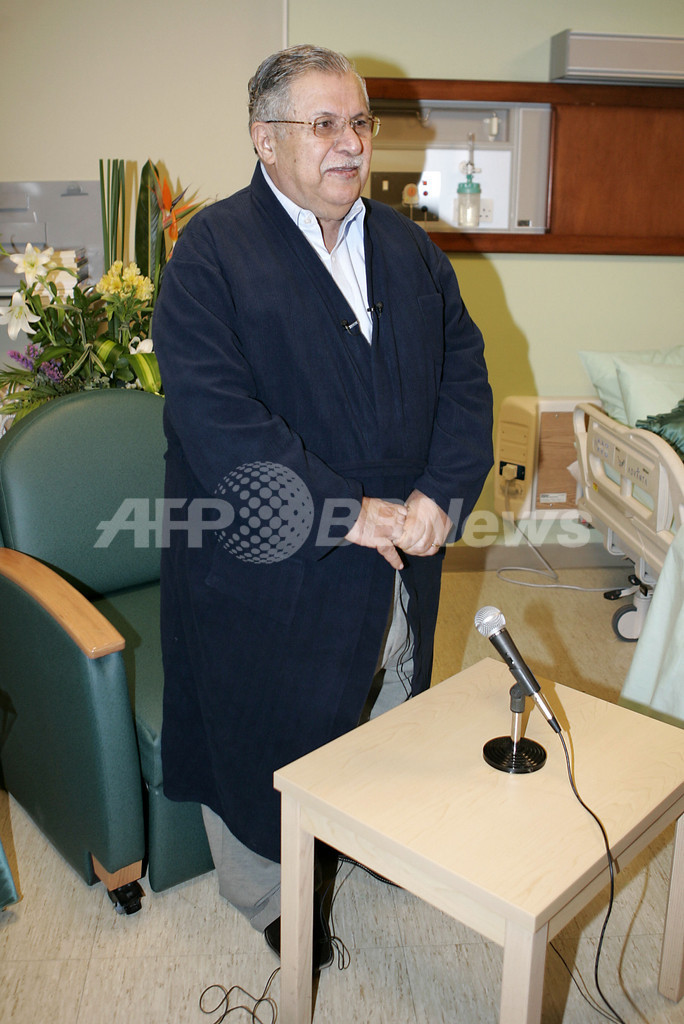 【アンマン/ヨルダン 2日 AFP】首都アンマン(Amman)で入院中のジャラル・タラバニ(Jalal Talabani)イラク大統領は1日、入院先の病院からのテレビ中継で元気な姿を見せた。タラバニ大統領は今後、検査のためさらに数日間入院を続けるが、同大統領の報道官は健康状態は良好だと語り、一部で報じられた重病説も否定している。写真は同日、病室からのテレビ中継を前に笑顔を見せるタラバニ大統領。(c)AFP/NADER DAOUD