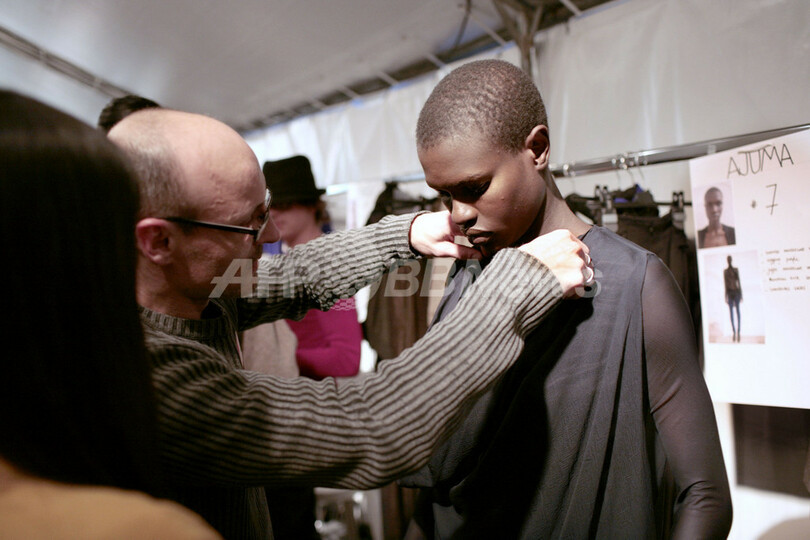 ここ数年は資金不足やゆるめの服で沈滞気味だったハイダー・アッカーマンが久し振りに持ち直した。グレーのゆったりとしたロングのコートとパンツ、トレンチコートが本来のセンスを生かしながら実用的に着られそうになった。ただしまだ不要なドレープが多く、高いハイヒールとのバランスもよくない。そんな中で、グレーのシンプルなレザーのジャケットが光っていた。写真は、新作を披露するモデル。(c)AFP/VINCENT NGUYEN