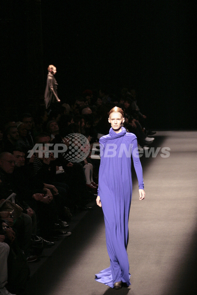ここ数年は資金不足やゆるめの服で沈滞気味だったハイダー・アッカーマンが久し振りに持ち直した。グレーのゆったりとしたロングのコートとパンツ、トレンチコートが本来のセンスを生かしながら実用的に着られそうになった。ただしまだ不要なドレープが多く、高いハイヒールとのバランスもよくない。そんな中で、グレーのシンプルなレザーのジャケットが光っていた。写真は、新作を披露するモデル。(c)AFP/VINCENT NGUYEN