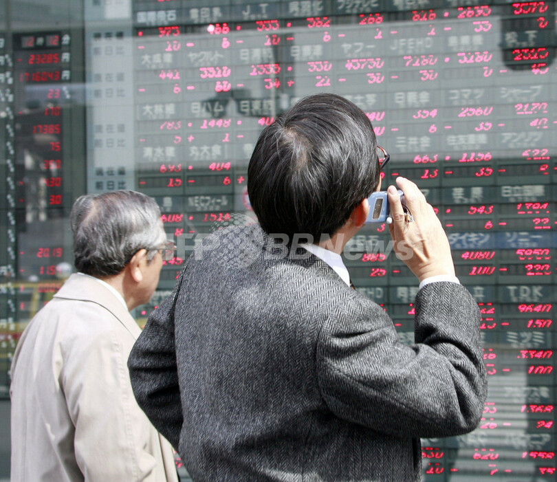 写真は2日、株式の電光掲示板を眺める人々。(c)AFP/Yoshikazu TSUNO