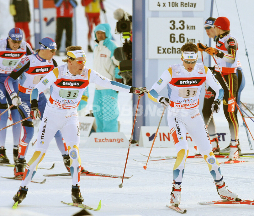 【札幌 1日 AFP】FISノルディックスキー世界選手権・札幌大会(FIS Nordic world skiing championships 2007 Sapporo)、クロスカントリー・男子4x10キロメートルリレー・クラシカル/フリー。ノルウェーは合計タイム1時間30分49秒2を記録し、2位のロシアに3秒2差をつけて優勝を飾った。写真は、チームメイトのPetter Northug(中央)を抱え上げ、優勝を喜ぶノルウェーの選手たち。(c)AFP/Kazuhiro NOGI