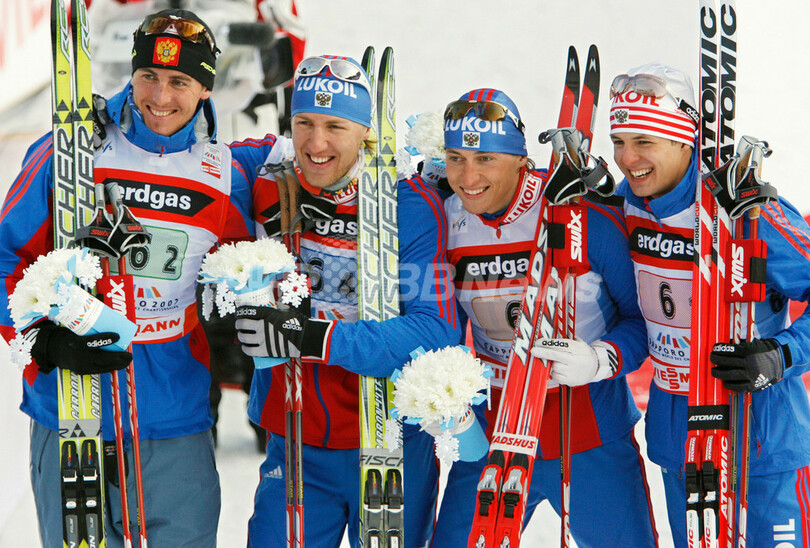 【札幌 1日 AFP】FISノルディックスキー世界選手権・札幌大会(FIS Nordic world skiing championships 2007 Sapporo)、クロスカントリー・男子4x10キロメートルリレー・クラシカル/フリー。ノルウェーは合計タイム1時間30分49秒2を記録し、2位のロシアに3秒2差をつけて優勝を飾った。写真は、チームメイトのPetter Northug(中央)を抱え上げ、優勝を喜ぶノルウェーの選手たち。(c)AFP/Kazuhiro NOGI
