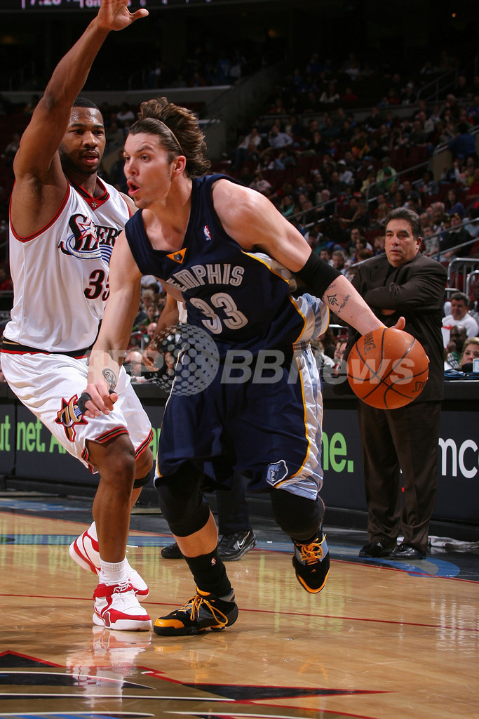 【フィラデルフィア/米国 2日 AFP】06-07NBA、フィラデルフィア・セブンティシクサーズ(Philadelphia 76ers)vsメンフィス・グリズリーズ(Memphis Grizzlies)。グリズリーズのパウ・ガソル(Pau Gasol)は、ゲームハイの31得点13リバウンド3ブロックと攻守に渡り活躍を見せたが、チームを勝利に導く事は出来なかった。試合はグリズリーズが112-117でセブンティシクサーズに敗れ、3連敗を喫した。写真は、セブンティシクサーズのサミュエル・ダレンバード(Samuel Dalembert)のディフェンスを突破するガソル。(c)AFP/Getty Images/NBAE Jesse D. Garrabrant
