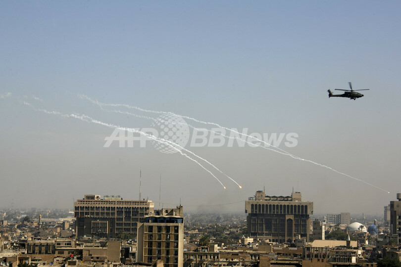 写真は同日、バグダッド上空を飛び、閃光(せんこう)弾を投下する米軍のAH-64アパッチヘリコプター。(c)AFP/PATRICK BAZ