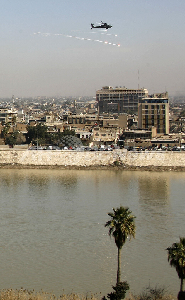 写真は同日、バグダッド上空を飛び、閃光(せんこう)弾を投下する米軍のAH-64アパッチヘリコプター。(c)AFP/PATRICK BAZ