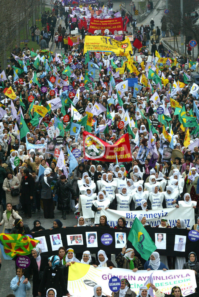 【イスタンブール/トルコ 5日 AFP】イスタンブール(Istanbul)のチャーラヤンスクェア(Caglayan Square)では4日、3月8日の「国際女性の日(International Women’s Day)」に先立ち、数千人の女性が集まり行進を繰り広げた。写真は4日、イスタンブールでの行進に参加する女性たち。(c)AFP/SEZAYI ERKEN