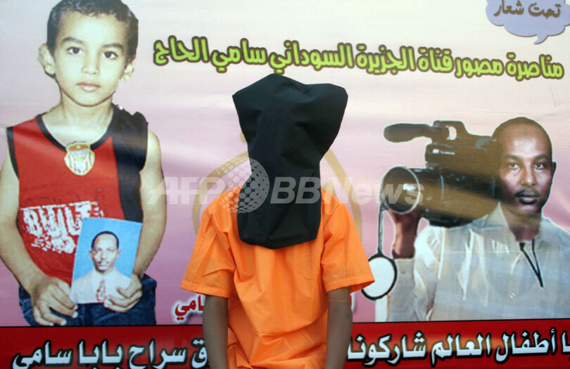 【ハルツーム/スーダン 5日 AFP】ハルツーム(Khartoum)で4日、キューバのグアンタナモ(Guantanamo)米海軍基地収容所に収容されているスーダン人カメラマン、Sami al-Haj氏の解放を求めてデモが実施された。衛星テレビアルジャジーラ(Al-Jazeera)の同カメラマンは、2001年12月にアフガニスタンとの国境でパキスタン軍に拘束され、告訴なしで2002年からグアンタナモに収容されている。写真は同日、グアンタナモの収容者に似せた衣服を着てハルツームでのデモに参加する子ども。(c)AFP/ISAM AL-HAJ