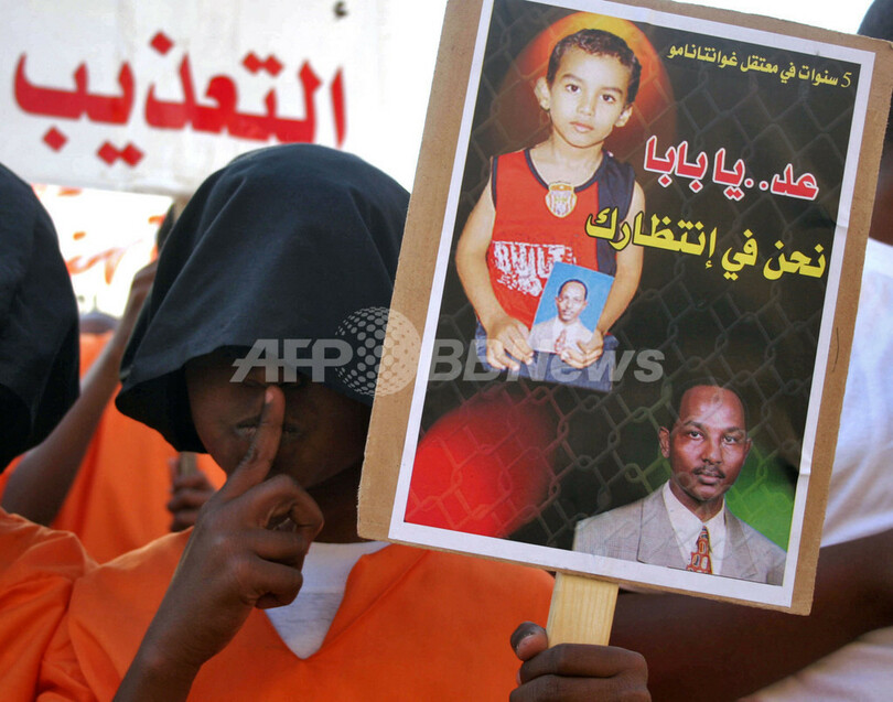 【ハルツーム/スーダン 5日 AFP】ハルツーム(Khartoum)で4日、キューバのグアンタナモ(Guantanamo)米海軍基地収容所に収容されているスーダン人カメラマン、Sami al-Haj氏の解放を求めてデモが実施された。衛星テレビアルジャジーラ(Al-Jazeera)の同カメラマンは、2001年12月にアフガニスタンとの国境でパキスタン軍に拘束され、告訴なしで2002年からグアンタナモに収容されている。写真は同日、グアンタナモの収容者に似せた衣服を着てハルツームでのデモに参加する子ども。(c)AFP/ISAM AL-HAJ