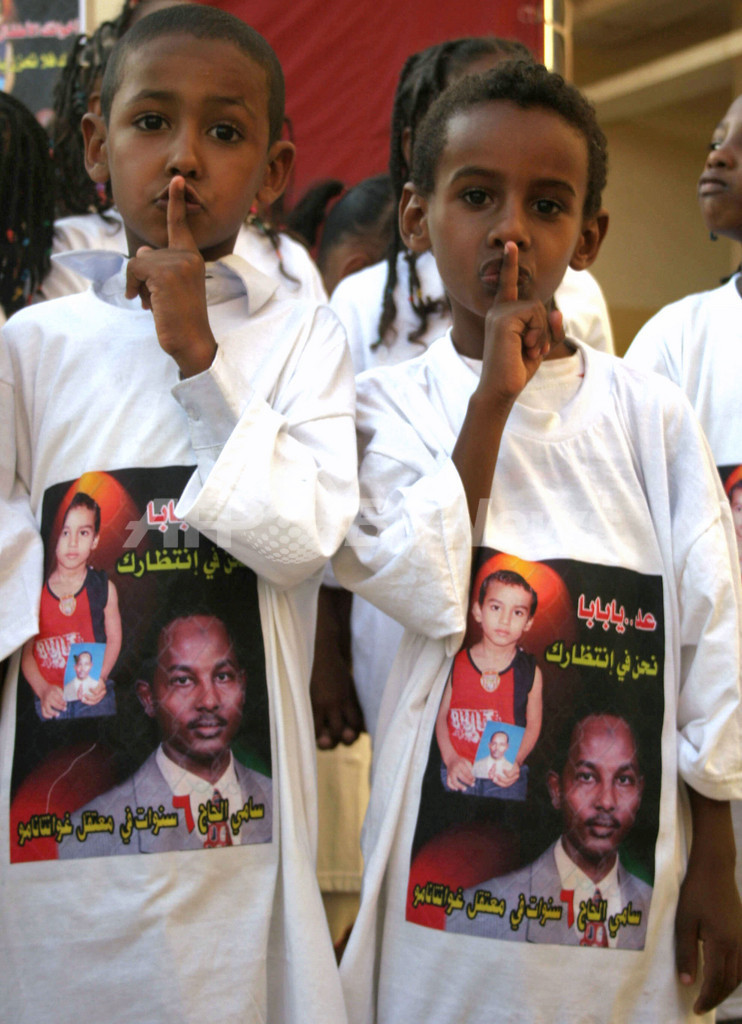 【ハルツーム/スーダン 5日 AFP】ハルツーム(Khartoum)で4日、キューバのグアンタナモ(Guantanamo)米海軍基地収容所に収容されているスーダン人カメラマン、Sami al-Haj氏の解放を求めてデモが実施された。衛星テレビアルジャジーラ(Al-Jazeera)の同カメラマンは、2001年12月にアフガニスタンとの国境でパキスタン軍に拘束され、告訴なしで2002年からグアンタナモに収容されている。写真は同日、グアンタナモの収容者に似せた衣服を着てハルツームでのデモに参加する子ども。(c)AFP/ISAM AL-HAJ