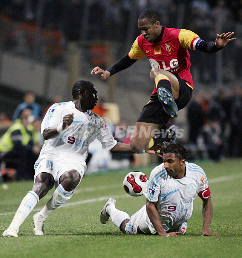【マルセイユ/フランス 4日 AFP】サッカー、フランス・リーグ1・第27節、オリンピック・マルセイユ(Olympique de Marseille)vsランス(Lens)。試合は後半14分にアルナ・ディンダン(Aruna Dindane)が奪ったゴールを守りきったランスが1-0でマルセイユを降し勝ち点を48に伸ばした。写真は、勝利の喜びを分かち合うランスの選手たち。(c)AFP/ANNE-CHRISTINE POUJOULAT
