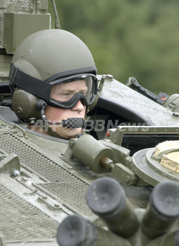 写真は、英国南部のドーセット(Dorset)州のボービントン(Bovington)で装甲車の訓練を受けるヘンリー王子(2006年7月7日撮影)。(c)AFP/Steve Dock