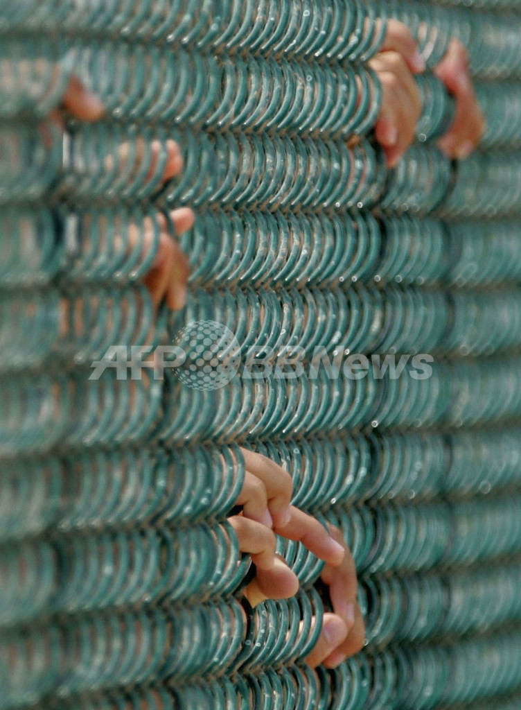 写真は、グアンタナモ収容所のフェンスにつかまる拘束者たち(2004年8月26日撮影)。(c)AFP/MARK WILSON