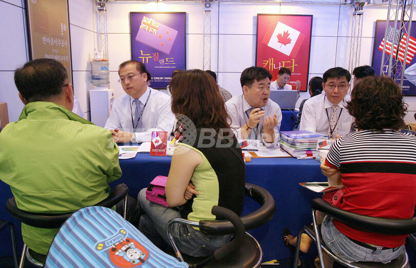 写真は、ソウルで開かれた東南アジアへの移住や留学に関する展示会で、出展社ブースで相談する来場者(2006年9月25日撮影)。(c)AFP/DONG-A ILBO