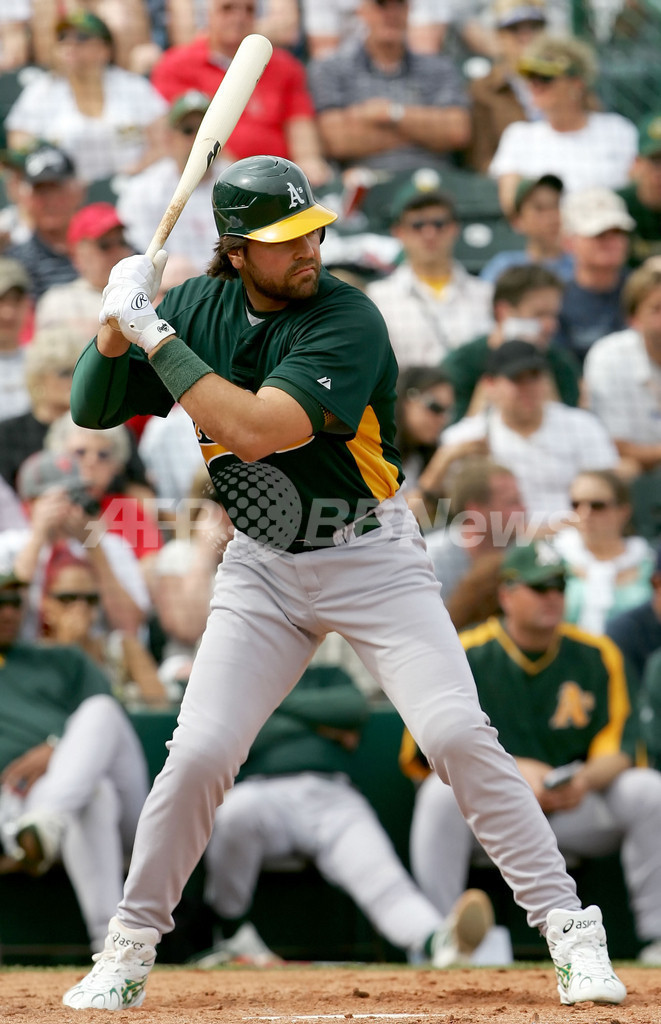 【テンピ/米国 5日 AFP】07MLB・オープン戦、ロサンゼルス・エンゼルス・オブ・アナハイム(Los Angeles Angels of Anaheim)vsオークランド・アスレチックス(Oakland Athletics)。アスレチックスのマイク・ピアザ(Mike Piazza)は、3打数ノーヒットに終わった。試合はアスレチックスが8-7でエンゼルスに勝利した。(c)AFP/Getty Images Lisa Blumenfeld
