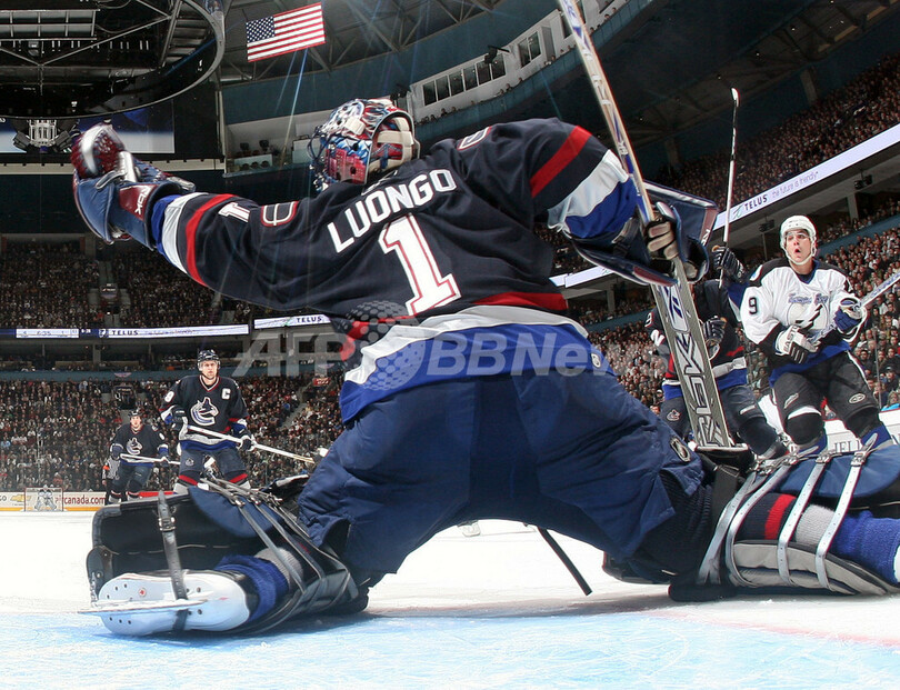 【バンクーバー/カナダ 6日 AFP】06-07NHL、バンクーバー・カナックス(Vancouver Canucks)vsタンパベイ・ライトニング(Tampa Bay Lightning)。試合は5-1でカナックスが快勝し、3連勝で今季39勝目を挙げた。写真は、試合に勝利しチームメイトのAlexandre Burrows、トレバー・リンデン(Trevor Linden、右)と喜び合うカナックスのゴーリー、ロベルト・ルオンゴ(Roberto Luongo、中)。(c)AFP/Getty Images Jeff Vinnick