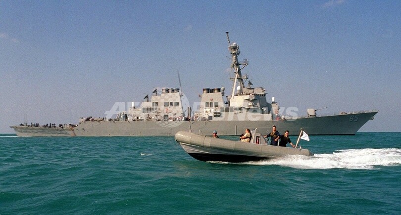 写真は、USS Benfoldと、その横を通過するA Rigid Hull Inflatable Boat (RHIB)(11月21日撮影)。(c)AFP