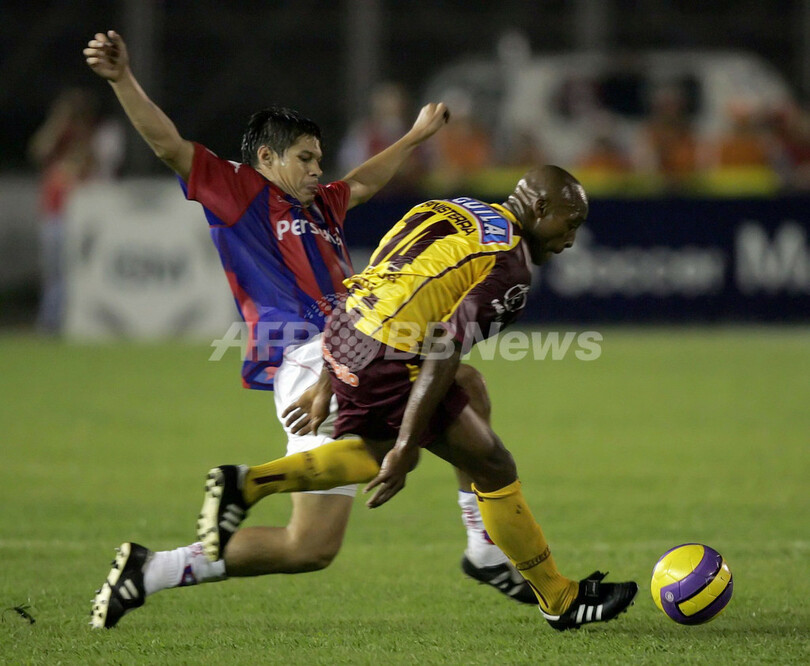 【イバゲ/コロンビア 7日 AFP】サッカー、リベルタドーレス杯南米選手権2007(Copa Libertadores de America 2007)・第2ラウンド、グループ3・第2節、デポルテス・トリマ(Deportes Tolima、コロンビア)vsセロ・ポルティーニョ(Cerro Porteno、パラグアイ)。試合は、ホームのデポルテス・トリマが1-0でセロ・ポルティーニョを降して第2ラウンド初白星を挙げた。写真は、セロ・ポルティーニョのアレハンドロ・ダ・シウバ(Alejandro Da Silva、右)を振り切ってボールを進めるデポルテス・トリマのブラハマン・シニステラ(Brahaman Sinisterra)。(c)AFP/Mauricio DUENAS