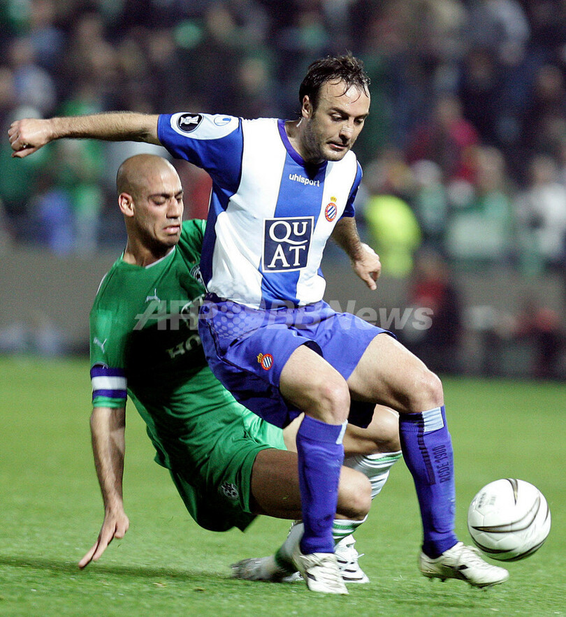 【テルアビブ/イスラエル 8日 AFP】サッカー、UEFA杯(UEFA Cup)・決勝トーナメント2回戦、マッカビ・ハイファ(Maccabi Haifa)vsエスパニョール(Espanyol)、第1戦。試合は0-0の引き分けに終わった。第2戦はエスパニョールのホームで行われる。写真は、ボールを競るマッカビ・ハイファのリオール・ラファエロフ(Lior Refaelov、右)とエスパニョールのヘスス・マリア・ラクルス(Jesus Maria Lacruz)。(c)AFP/YOAV LEMMER