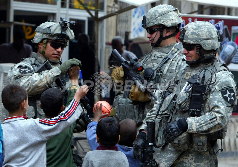 写真は8日、バグダッド市内でイラク人少年らと遊ぶ駐留米兵。(c)AFP/ALI YUSSEF