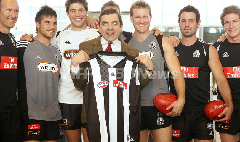 【メルボルン/オーストラリア 9日 AFP】主演を務めるビーン映画第2弾「Mr Bean’s Holiday」のプロモーションのため、オーストラリアを訪れている英国人コメディアンで俳優のローワン・アトキンソン(Rowan Atkinson)が9日、オーストラリアン・ルールズ・フットボール、AFL(Australian Football League)のチーム、コリンウッド・フットボール・クラブ(Collingwood Football Club)を訪問した。同映画は世界に先駆けて、オーストラリアとニュージーランドで29日から公開される。写真は同クラブの選手らと記念撮影を行なうアトキンソン(中央)。(c)AFP/William WEST