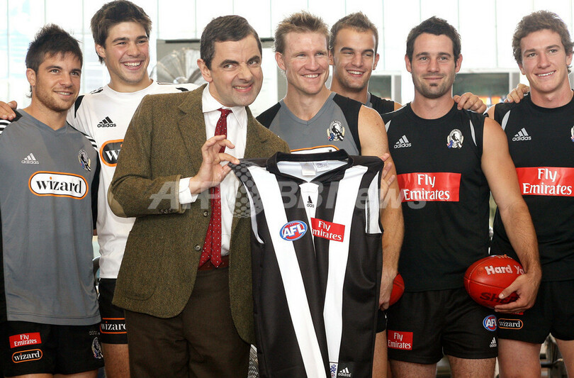 【メルボルン/オーストラリア 9日 AFP】主演を務めるビーン映画第2弾「Mr Bean’s Holiday」のプロモーションのため、オーストラリアを訪れている英国人コメディアンで俳優のローワン・アトキンソン(Rowan Atkinson)が9日、オーストラリアン・ルールズ・フットボール、AFL(Australian Football League)のチーム、コリンウッド・フットボール・クラブ(Collingwood Football Club)を訪問した。同映画は世界に先駆けて、オーストラリアとニュージーランドで29日から公開される。写真は同クラブの選手らと記念撮影を行なうアトキンソン(中央)。(c)AFP/William WEST
