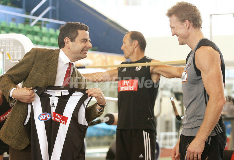 【メルボルン/オーストラリア 9日 AFP】主演を務めるビーン映画第2弾「Mr Bean’s Holiday」のプロモーションのため、オーストラリアを訪れている英国人コメディアンで俳優のローワン・アトキンソン(Rowan Atkinson)が9日、オーストラリアン・ルールズ・フットボール、AFL(Australian Football League)のチーム、コリンウッド・フットボール・クラブ(Collingwood Football Club)を訪問した。同映画は世界に先駆けて、オーストラリアとニュージーランドで29日から公開される。写真は同クラブの選手らと記念撮影を行なうアトキンソン(中央)。(c)AFP/William WEST