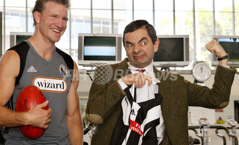 【メルボルン/オーストラリア 9日 AFP】主演を務めるビーン映画第2弾「Mr Bean’s Holiday」のプロモーションのため、オーストラリアを訪れている英国人コメディアンで俳優のローワン・アトキンソン(Rowan Atkinson)が9日、オーストラリアン・ルールズ・フットボール、AFL(Australian Football League)のチーム、コリンウッド・フットボール・クラブ(Collingwood Football Club)を訪問した。同映画は世界に先駆けて、オーストラリアとニュージーランドで29日から公開される。写真は同クラブの選手らと記念撮影を行なうアトキンソン(中央)。(c)AFP/William WEST
