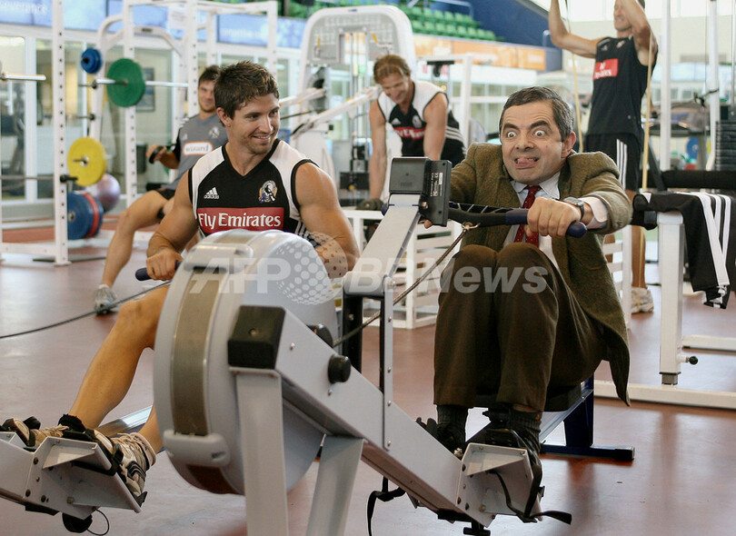 【メルボルン/オーストラリア 9日 AFP】主演を務めるビーン映画第2弾「Mr Bean’s Holiday」のプロモーションのため、オーストラリアを訪れている英国人コメディアンで俳優のローワン・アトキンソン(Rowan Atkinson)が9日、オーストラリアン・ルールズ・フットボール、AFL(Australian Football League)のチーム、コリンウッド・フットボール・クラブ(Collingwood Football Club)を訪問した。同映画は世界に先駆けて、オーストラリアとニュージーランドで29日から公開される。写真は同クラブの選手らと記念撮影を行なうアトキンソン(中央)。(c)AFP/William WEST