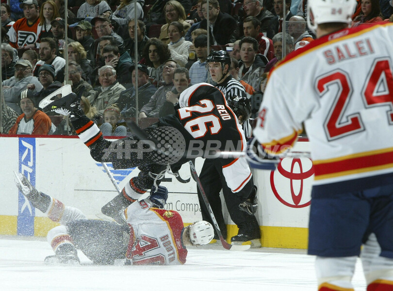 【フィラデルフィア/米国 8日 AFP】06-07NHL、フィラデルフィア・フライヤーズ(Philadelphia Flyers)vsフロリダ・パンサーズ(Florida Panthers)。パンサーズのゴーリー、エド・ベルフォア(Ed Belfour)は26セーブの活躍でチームの勝利に貢献し、ファーストスターに輝いた。試合はパンサーズが2-1でフライヤーズに勝利した。写真は、試合前のウォームアップを行うベルフォア。(c)AFP/Getty Images Mike Stobe