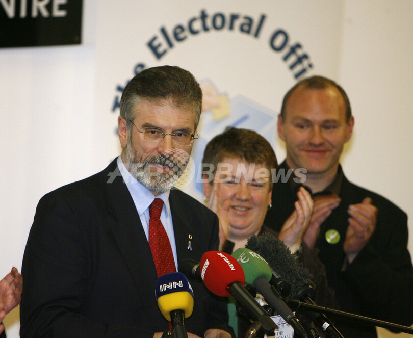 写真は北アイルランドのベルファスト(Belfast)で9日、議会選挙で議席を維持し記者会見に臨むシン・フェイン党(Sinn Fein)のジェリー・アダムズ(Gerry Adams)党首(左)と同党候補者。(c)AFP/PETER MUHLY