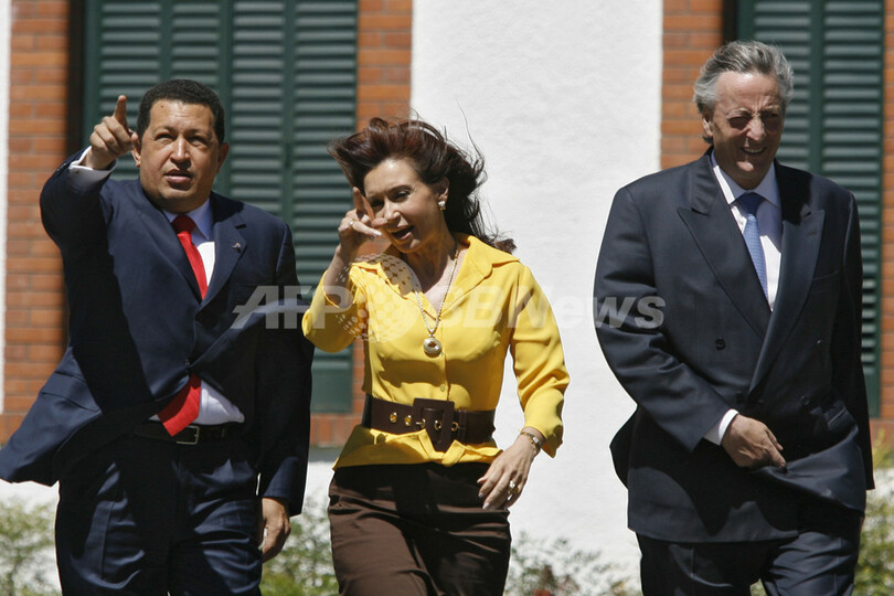 写真は同日、ブエノスアイレスの大統領官邸でネストル・キルチネル(Nestor Kirchner)アルゼンチン大統領およびCristina同夫人(中央)と連れ立って歩くチャベス大統領(左)。(c)AFP/Juan MABROMATA