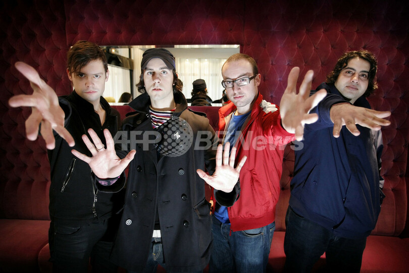 【パリ/フランス 10日 AFP】ワールドツアー中の英ロックバンド、マキシモ・パーク(Maximo Park)が9日、パリのホテルで写真撮影を行った。彼らの3rdアルバム「Our Earthly Pleasures」は4月2日にリリース予定。写真は(左から)キーボード奏者のルーカス・ウーラー(Lukas Wooller)、ボーカリストのポール・スミス(Paul Smith)、ギタリストのダンカン・ロイド(Duncan Lloyd)、ベーシストのアーキス・ティク(Archis Tiku)。ドラマーのトム・イングリッシュ(Tom English)はこの写真には入っていない。(c)AFP/GUILLAUME BAPTISTE