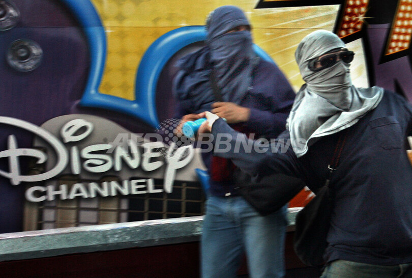 【ブエノスアイレス/アルゼンチン 10日 AFP】ジョージ・W・ブッシュ(George W.Bush)米大統領の中南米歴訪に反対を唱える一団が9日、アルゼンチンの首都ブエノスアイレス(Buenos Aires)の米国商業会議所の前で暴徒化し、警官隊と衝突した。ブッシュ大統領は、各地で抗議活動が繰り広げられるなか、9日からブラジル、ウルグアイ、コロンビア、グアテマラ、およびメキシコの歴訪を開始している。一方、アルゼンチンを訪問中のベネズエラのウゴ・チャベス(Hugo Chavez)大統領は、「反米国帝国主義」を掲げて集会を行った。写真は9日、ブエノスアイレス市内で警官に物を投げる暴徒。(c)AFP/DANIEL GARCIA