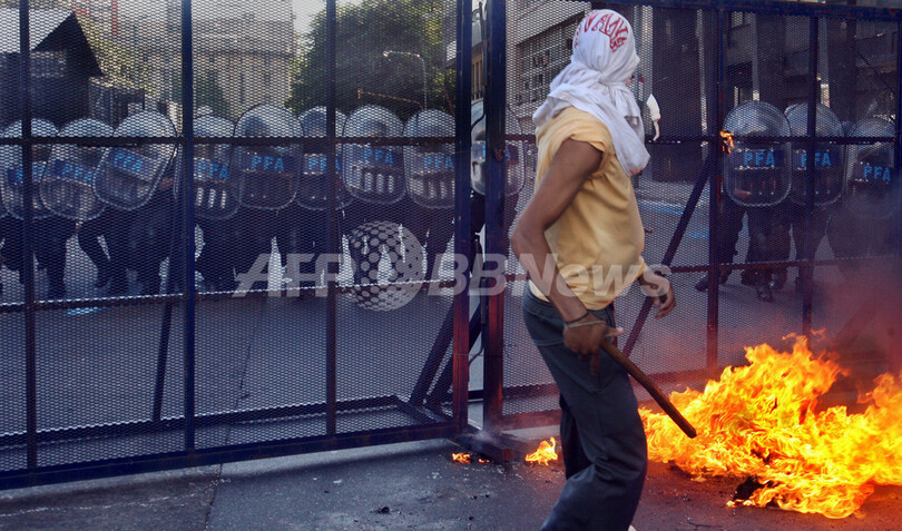 【ブエノスアイレス/アルゼンチン 10日 AFP】ジョージ・W・ブッシュ(George W.Bush)米大統領の中南米歴訪に反対を唱える一団が9日、アルゼンチンの首都ブエノスアイレス(Buenos Aires)の米国商業会議所の前で暴徒化し、警官隊と衝突した。ブッシュ大統領は、各地で抗議活動が繰り広げられるなか、9日からブラジル、ウルグアイ、コロンビア、グアテマラ、およびメキシコの歴訪を開始している。一方、アルゼンチンを訪問中のベネズエラのウゴ・チャベス(Hugo Chavez)大統領は、「反米国帝国主義」を掲げて集会を行った。写真は9日、ブエノスアイレス市内で警官に物を投げる暴徒。(c)AFP/DANIEL GARCIA